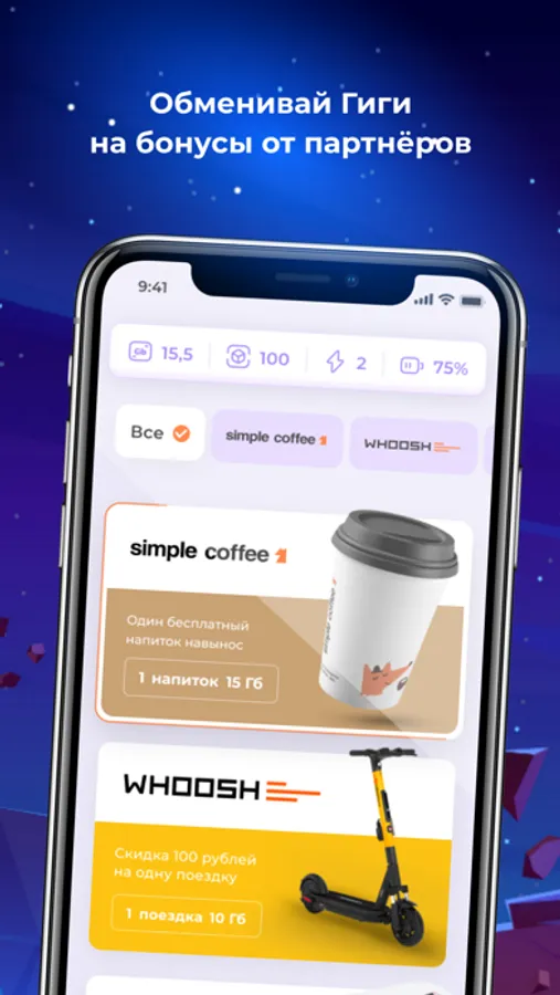 Обменивай на реальный интернет или промокоды партнеров: например, кофе от Simple Coffe или поездки на самокатах Whoosh.