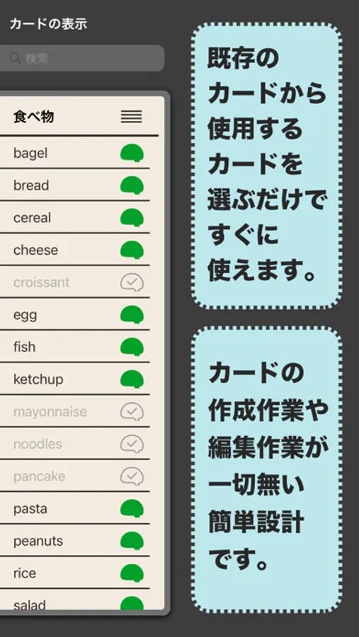 ・収録してある約600個のカードの中から表示させたいカードを選ぶだけですぐに使えます。