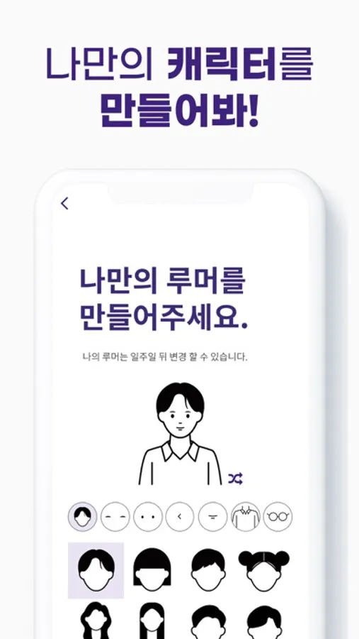 루머의 캐릭터는 7일마다 1번씩 바꿀 수 있어요. 일주일에 한 번씩 내 캐릭터에 변화를 주어 꾸미는 재미와 캐릭터를 통해 자신만의 매력을 표현해봐요! 루머는 남,여 성별 구분없이 모든 동일한 이미지를 제공해요!