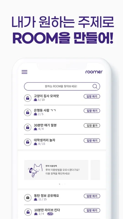 루머의 ROOM은 공개 / 비공개 ROOM 선택과 들어올 수 있는 인원을 설정 할 수 있어, 원하는 사람들과 링크 공유를 통해 대화가 가능해요! 방 개설자는 1회당 1시간 영상과 음성 라이브 방송을 진행 할 수 있어요! 라이브 방송이 종료되도 실시간 채팅은 계속 할 수 있으니 가끔 라이브 방송을 진행해보세요!