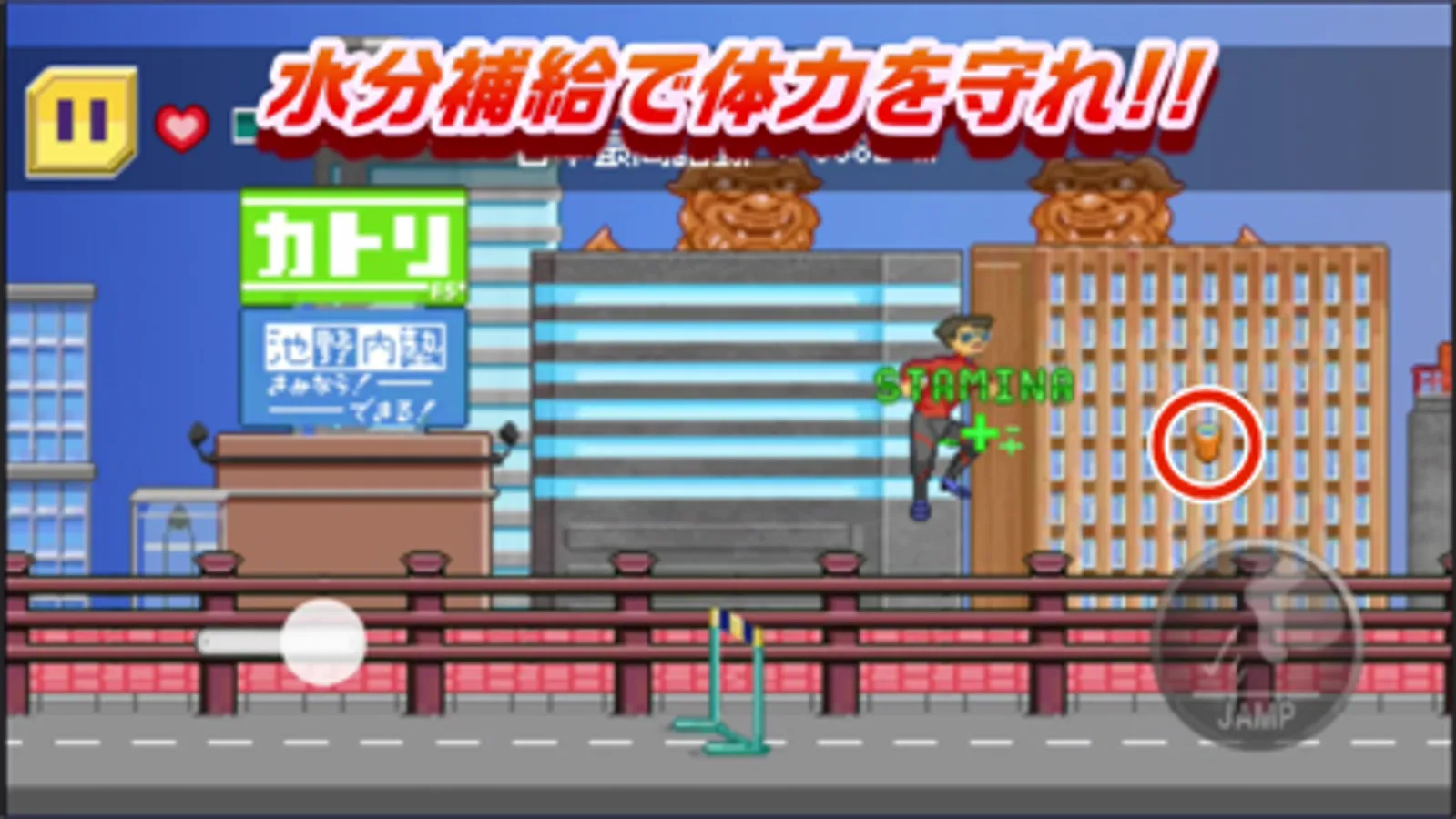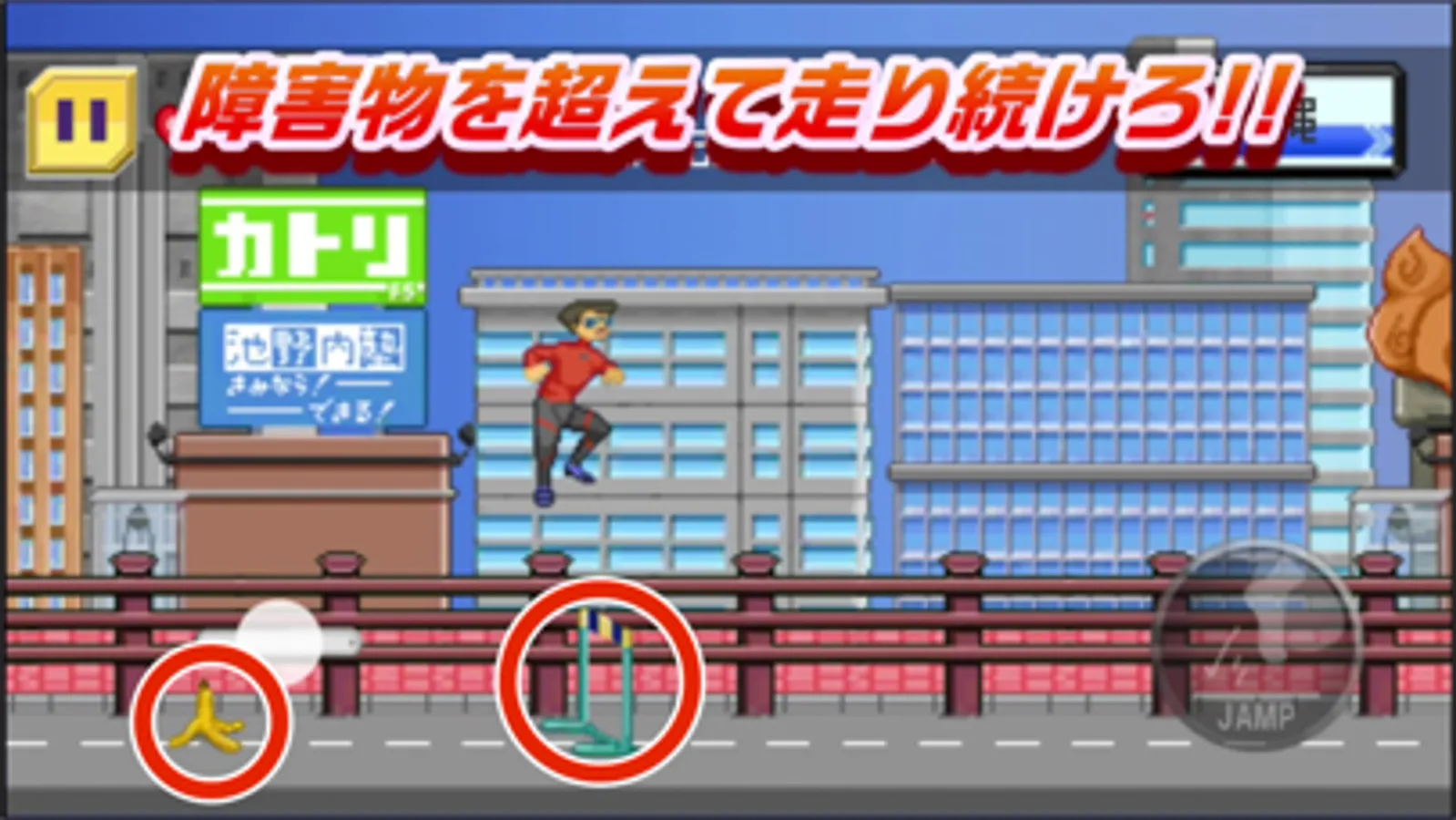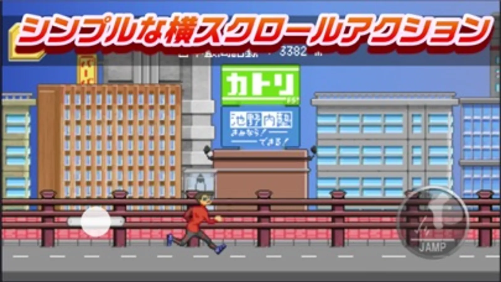 おじさん(プレイヤー)が走破距離を競う横スクロールアクションゲーム!
