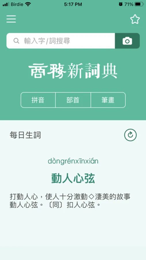 直接輸入字詞,或按拼音/筆畫索引搜尋,或用攝像鏡頭識別字詞,隨時隨地方便搜尋學習字詞