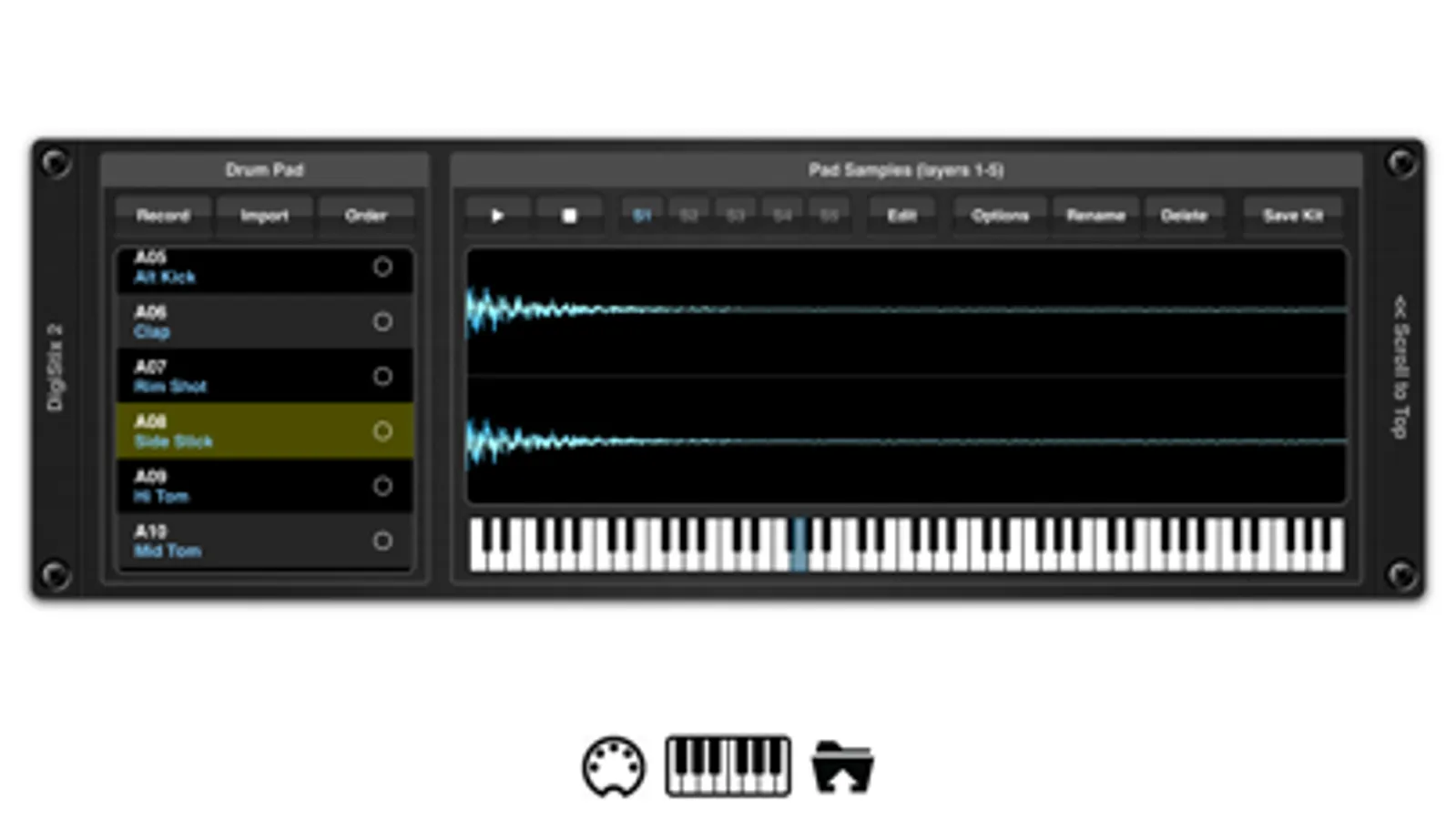 This new version of DigiStix brings some distinct advantages over its predecessor, most notably the ability to host up to 64 samples per drumkit with 5 layers per pad. The interface has been drastically redesigned for iPad to make better use of full screen mode, allowing a popular MPC style 4x4 pad layout with 4 banks of samples. Digistix 2 also allows greater control over the multi-sample layers, with the ability to individually control the volume levels and pitch of layers as well as global pitch and tune settings all from the new sample window.