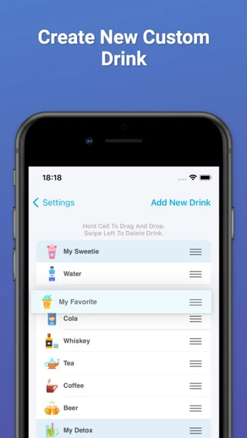 There are many various of drinks in the water tracker by default. You can manage various types of drinks easily. You can add, remove or edit of drinks. Also you can make sort for drinks.