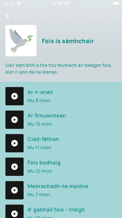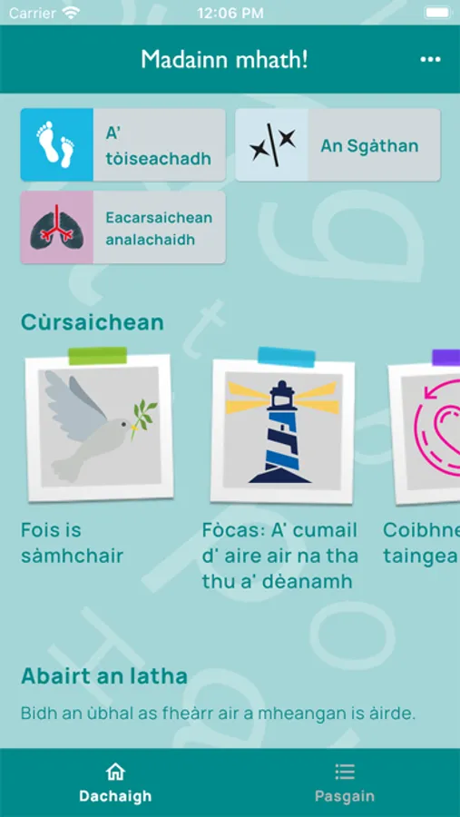 Use this app to interact with your emotions through the medium of Scottish Gaelic. Mothachas has been organised to reflect day-to-day situations and emotional contexts, and it contains a range of recorded meditations and breathing exercises.