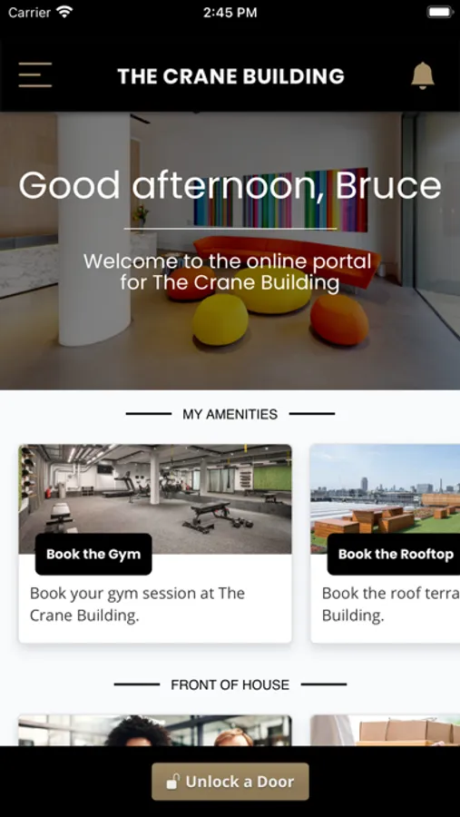 The Crane Building app gives occupiers access to a range of concierge services including delivery notifications and amenity bookings. The app also keeps occupiers up to date with the latest building announcements and social events.