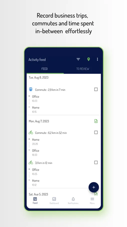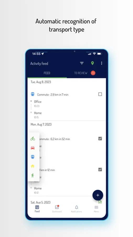 Car, public transport, bike or working from home, no matter the transport type you choose, it will be added next to your trip in the timeline.