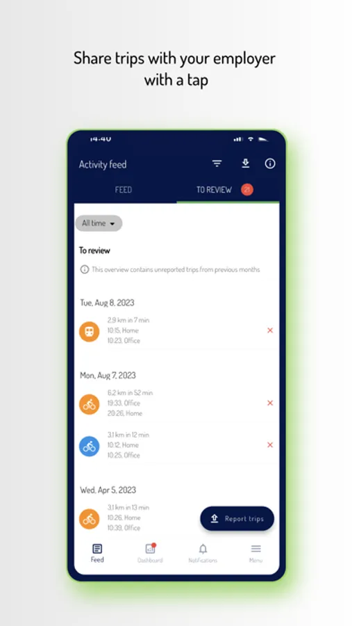Share trips with your employer at the press of a button. Each of your trips in the timeline have an option to be uploaded into your company’s system.