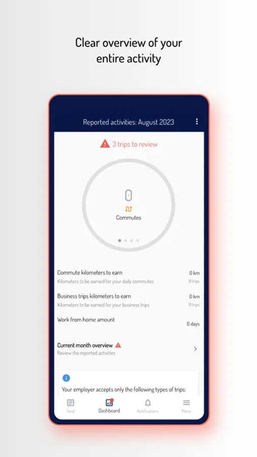The dashboard will show you the kilometers earned for each of your business trips for the current month.