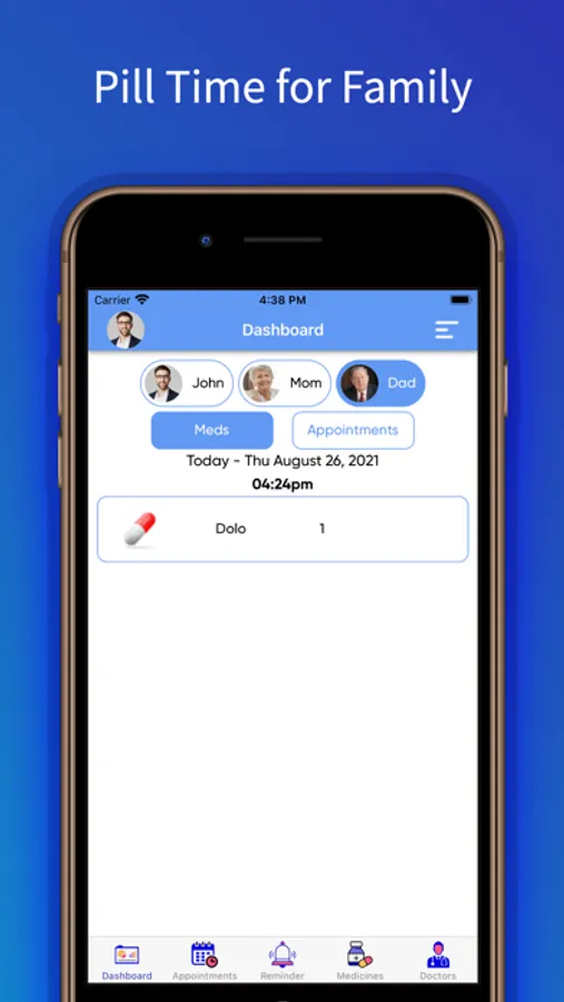 Pill Time For Family is easy to use and meant for FAMILY use who cares for their family members. Besides regular pill time reminders and notifications, you can also add appointments to the doctor, and set up reminders etc.