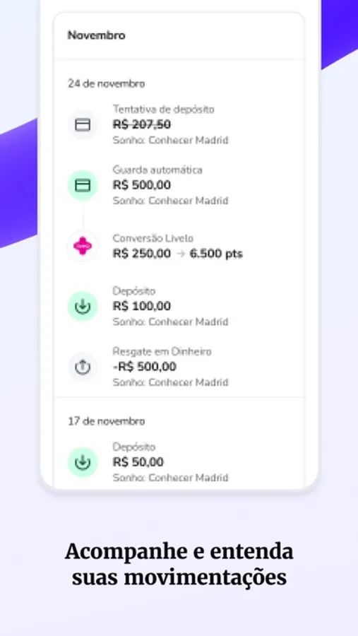 E acompanhe seu progresso! Toda semana, a quantia que você informou que deseja será cobrada no seu cartão de crédito, e em questão de tempo seu sonho será realizado. Você também pode ver de perto quanto já guardou e quanto já rendeu ou irá render.