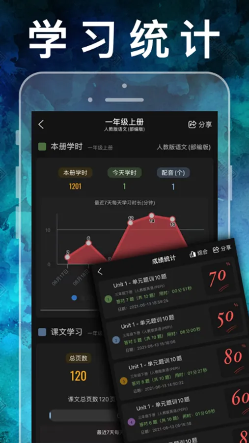 学习成就:图表统计学习情况,孩子的学习情况、训练成果五目了然。