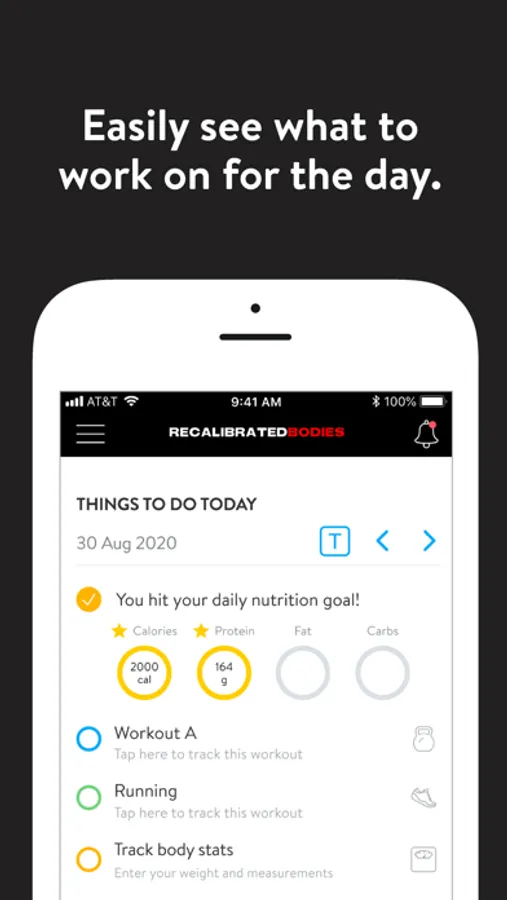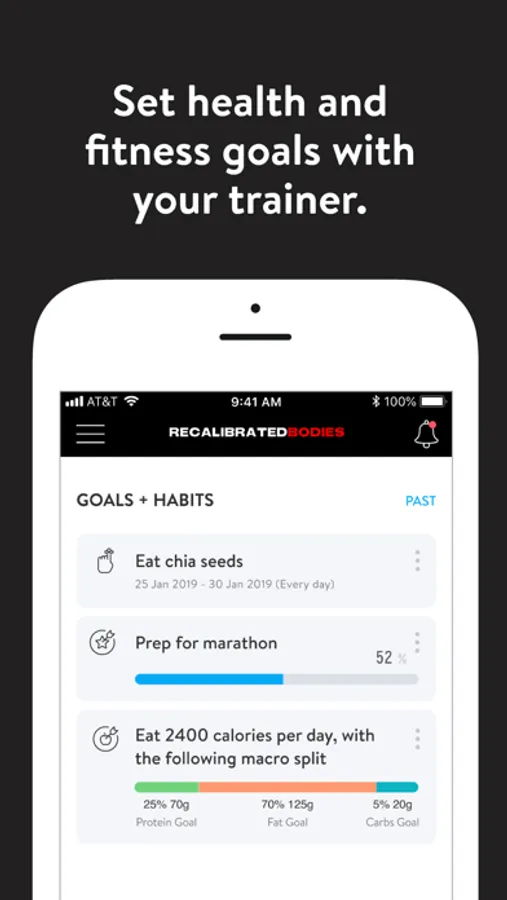 With the Recalibrated Bodies App, you can start tracking your workouts and meals, measuring results, and achieving your fitness goals, all with the help of your health and fitness coach.