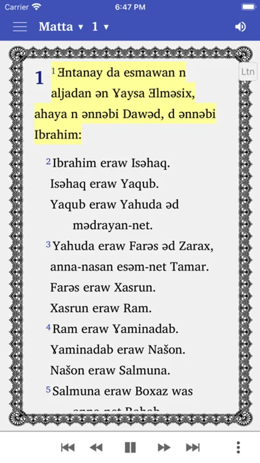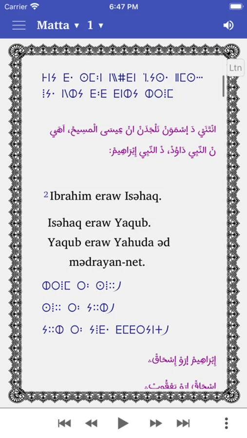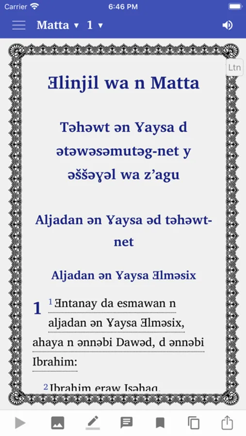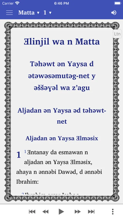 This is the official translation of the New Testament (or Linjil, or Elinjil) as used in the printed versions in Latin, Shifinagh, and Ajami scripts.