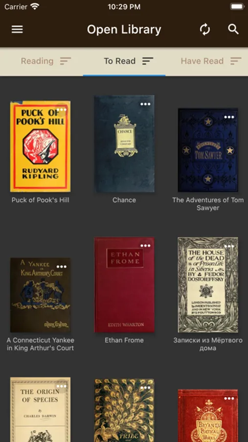 The moment you open the app and log in, any books you've already saved on the Open Library site are laid out on your screen. You can sort them by title, author, publication date, and date saved, see which books are available to read, and open them with a single tap.