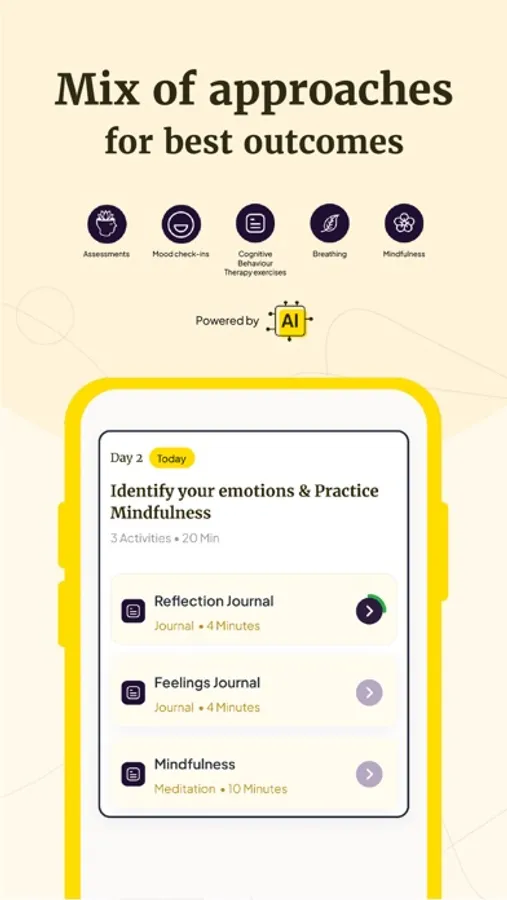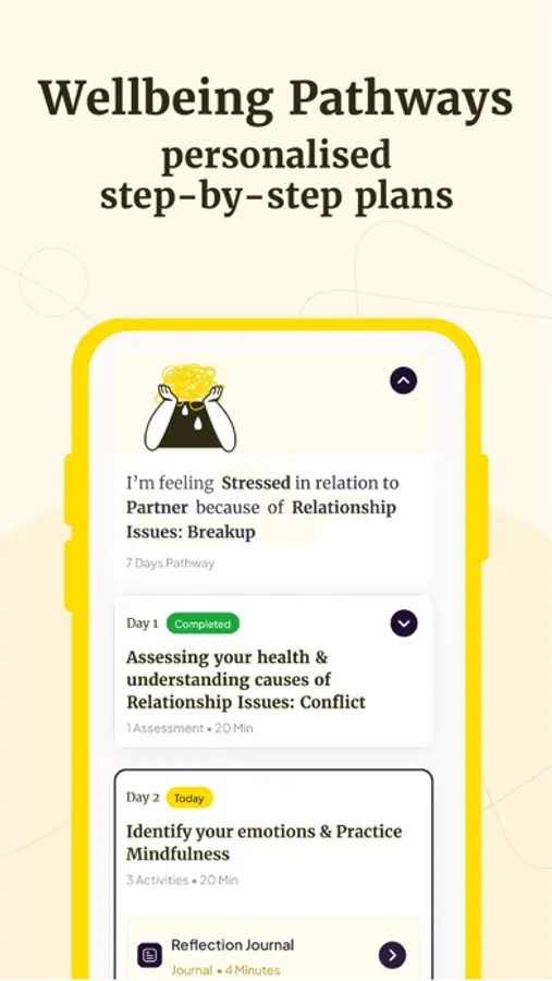 Personalised AI-powered Wellbeing Pathways: Our team of mental health professionals has curated Wellbeing Pathways that blend approaches like BT & CBT, along with mindfulness, meditation and breathing exercises to create a personalised plan tailored to your needs.