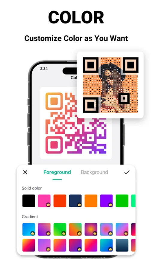 - Color: We offer lots of solid colors to make the QR Code colorful