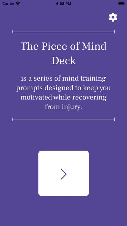 If you feel that you were dealt a bad hand or that the decks were stacked against you, well here is a new set of cards. The Piece of Mind app is a series of mind training prompts designed to keep you motivated while recovering from injury. This app is designed to strengthen your rehabilitation mindset. This mental strength training tool focuses on four themes: