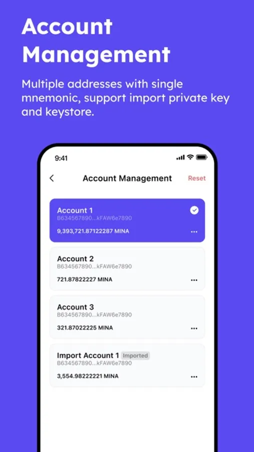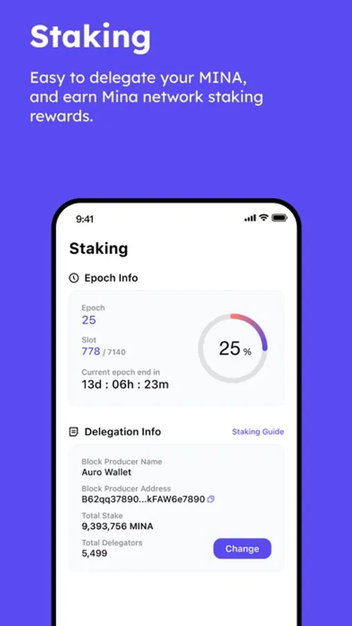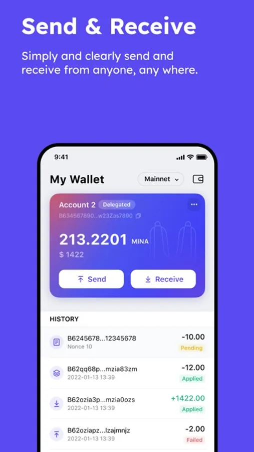 Easily send, receive or stake your MINA, and view the transaction history anytime.