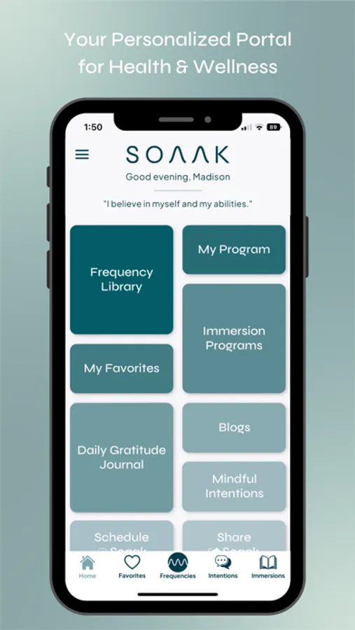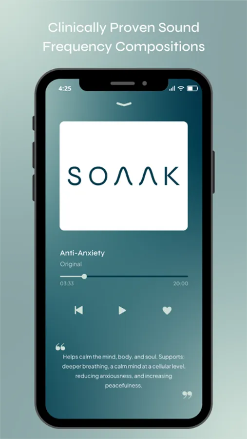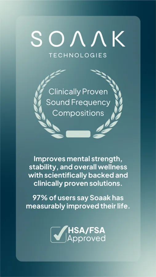 Sound Frequencies: Proprietary, clinically proven sound frequencies that help the mind and body resonate at healthy cellular levels, improving mood, mental strength, and resilience. Our soothing sound frequencies are professionally curated and mixed for maximum efficacy by a team of doctors, scientists, and health practitioners. Simply listen to your favorite sound frequencies for a specific desired outcome. Five minutes of Soaak frequencies has been compared to one hour of meditation, but with greater results.