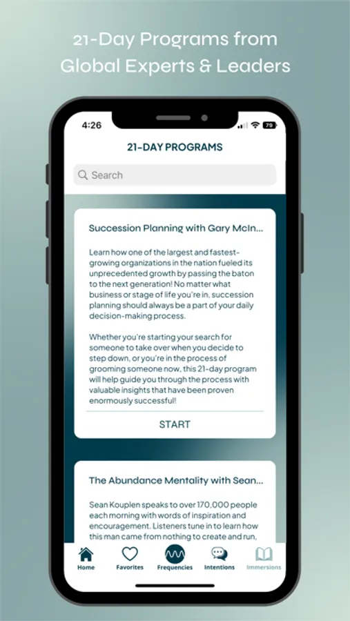 Immersion Programs: Custom 21-day programs providing education, inspiration, and insight from global thought leaders in their areas of expertise. Each expert personally delivers powerful sessions of up to five minutes each day to teach lessons and inspire your progress in any area of your life – finance, relationships, leadership, inspiration, spirituality, and more!