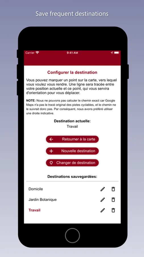 A straight guideline can be displayed to indicate the orientation towards the destination.