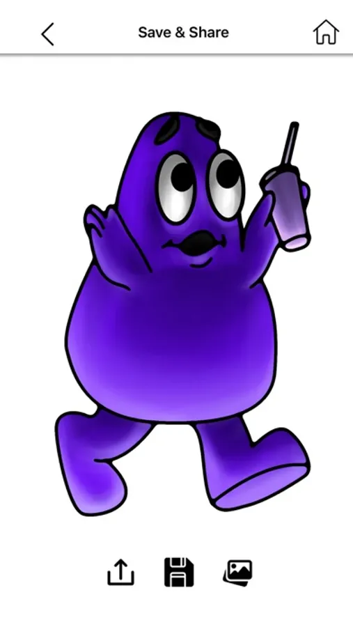 Once you've completed a coloring page, GrimaceShake Coloring Book lets you save and share your artwork with friends and family. You can showcase your creativity on social media platforms or even print your creations to display them as physical keepsakes.