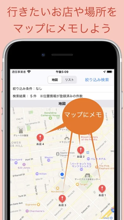 登録すると地図/リスト画面に登録した情報が表示されます。