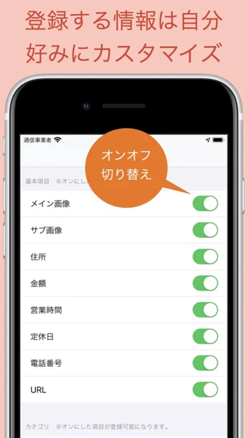 登録設定画面のオンオフを切り替えることにより入力/表示が不要な情報を非表示にすることもできます。