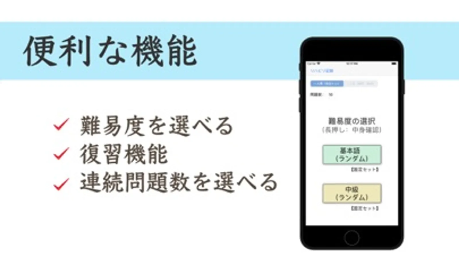 ・ランダム提示だけでなく、10語ずつ固定セットで練習も可能