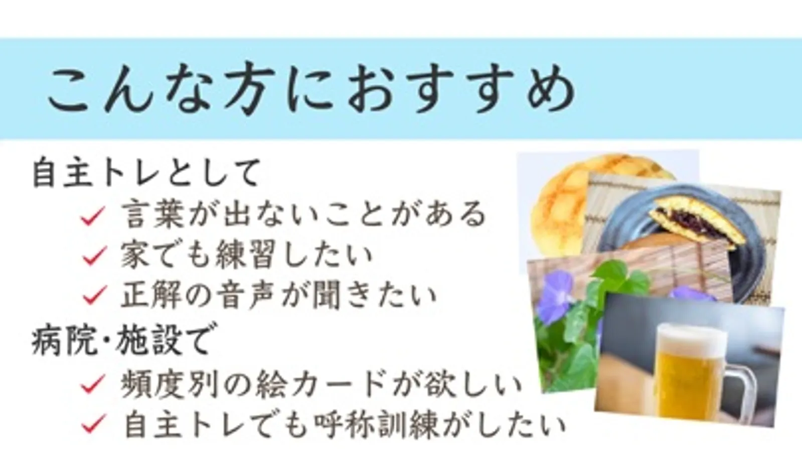従来の絵カードの代わりとして、臨床での使用や自主トレーニングでの使用を想定しています。