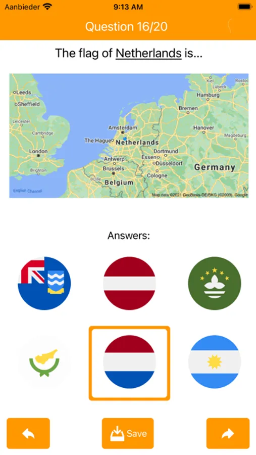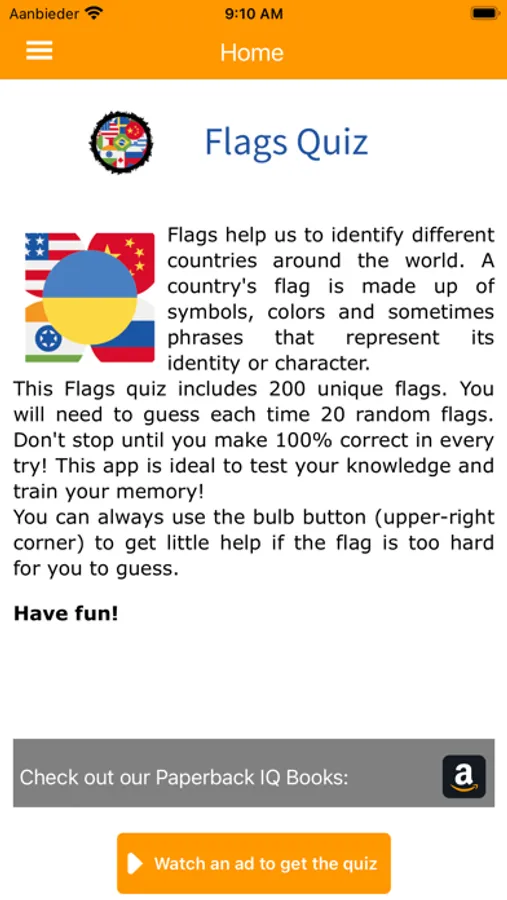 This Flags quiz includes 180 unique flags. You will need to guess each time 20 random flags. Don't stop until you make 100% correct in every try! This app is ideal to test your knowledge and train your memory!