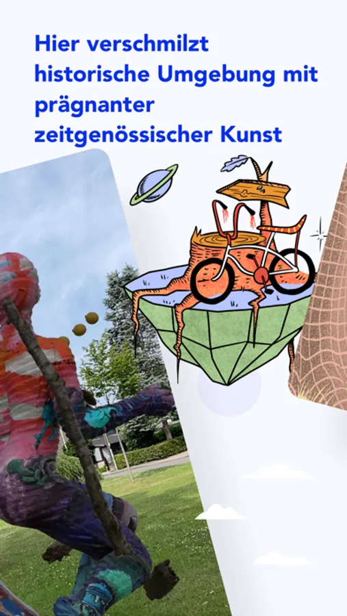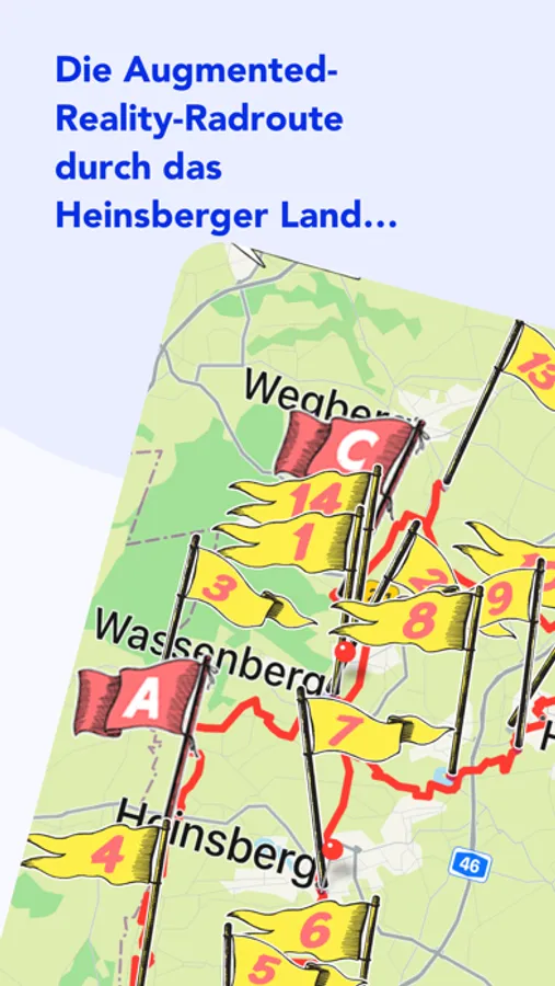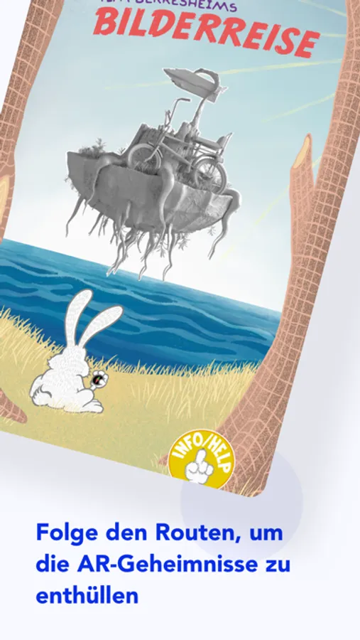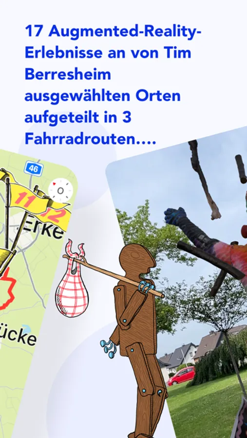 Tim Berresheims Bilderreise – die Augmented-Reality-Radroute durch das Heinsberger Land Willkommen im Heinsberger Land, wo die Landschaft weit ist und der Horizont unendlich. Hier, in der westlichsten Ecke Deutschlands, treffen sich Natur und Kultur, verbunden durch ein über550 km bestens ausgebautes Radwegenetz mit Knotenpunktsystem. Tim Berresheims Bilderreise ist in dieses intuitiv befahrbare Streckennetz integriert und bis zu 90 km lang. Zur Auswahl stehen ein landschaftlich begeisternder Rundkurs sowie dessen Auf-teilung in eine West- (ca. 51 km) und eine Ostschleife (ca. 45 km). Hier verschmilzt die historische Umgebung mit prägnanter zeitgenössischer Kunst, die durch modernste Technologie entstand – auf noch nie dagewesene Art und Weise. „TB – Bilderreise AR“ erweitert die Wirklichkeit um min. 17 Augmented-Reality-Erlebnisse an von Tim Berresheim ausgewählten Orten. Entlang der Strecke gibt es viele computeranimierte Werke des digital arbeitenden Künstlers zu entdecken und begehen.Wenn man der Routenstrecke folgt und den blau gefärbten Radius eines Augmented-Reality-Objekts betritt, zeigt die App an, welches Kunstwerk sich in der Nähe befindet. Durch Tippen auf den Hinweis aktiviert man das Objekt. Wenn man den Button mit Hasenpfote und Pinsel berührt, kann man Fotos schießen oder kurze Filmchen drehen, die direkt auf dem Gerät gespeichert werden können.Noch mehr über die Nutzungsmöglichkeiten dieser App bietet das Tutorial-Video mit John Lemon. Dort wird auch erklärt, wie man erste Augmented-Reality-Erfahrungen sammeln kann – auch ohne vor Ort zu sein.Zur Orientierung auf dem Rad hilft die Routenkarte der App, zusammen mit einem kostenfreienPocketguide (Die Online-Version findet man auf heinsberger-land.de) und beschilderten Wegweisern entlang der einzelnen Abschnitte.Tim Berresheim, seine Studios New Amerika und das ganze Heinsberger Land wünschen viel Spaß beim Radeln und Entdecken der versteckten Werke der Bilderreise.