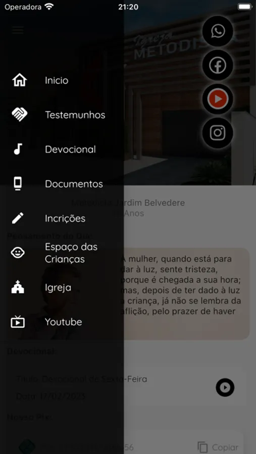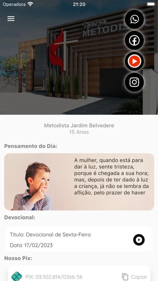 Faça suas inscrições para eventos, assista suas lives, tenha acesso ao canal da sua igreja direto do YouTube, crie escalas, tenha acesso a devocionais e muito mais...
