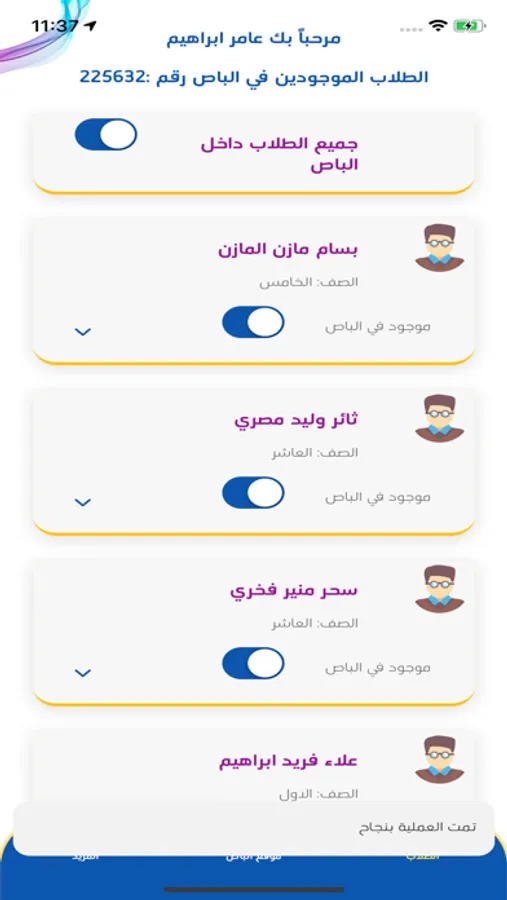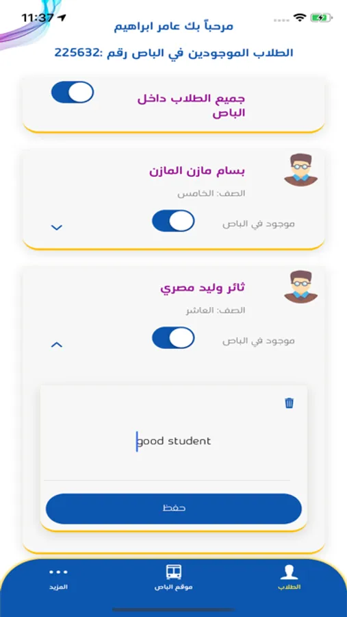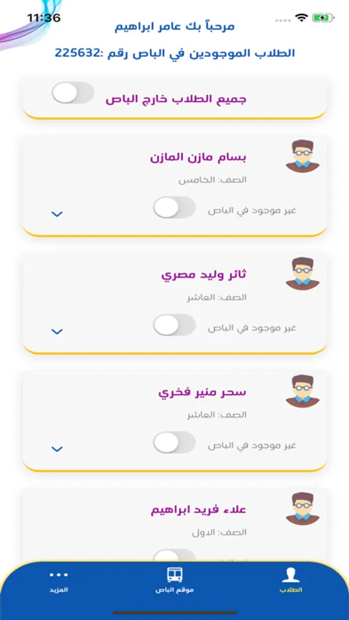 يعرض التطبيق الطلاب المشتركين بالباص وحالتهم هل هم بالباص ٫أم لا