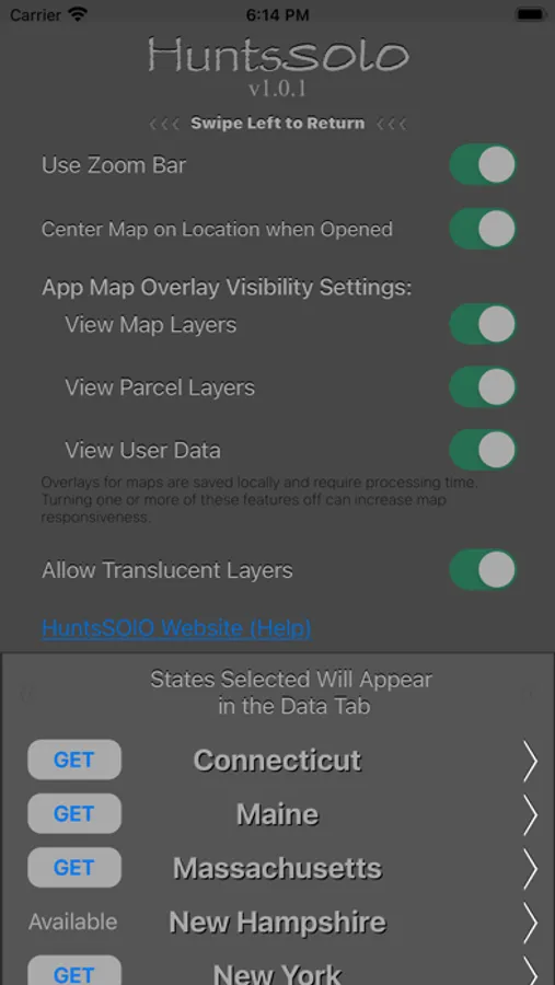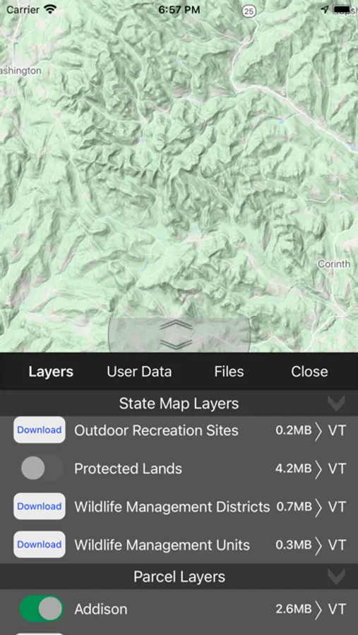 Many states have property line, public land, elevation and other map layer data that can be downloaded and loaded locally on your device. Available map layers can be viewed in the main menu. Selecting GET for any state will make those layers available on the data tab menu. Once a layer is downloaded and loaded, your local dataset is queried and layer data is drawn as you interact with the map. Many map layers have attributed data that is displayed on the map itself or can be viewed by tapping the item on the map. Map layer data is for informal reference only. Refer to your local municipality or your states geospatial authority for official records.