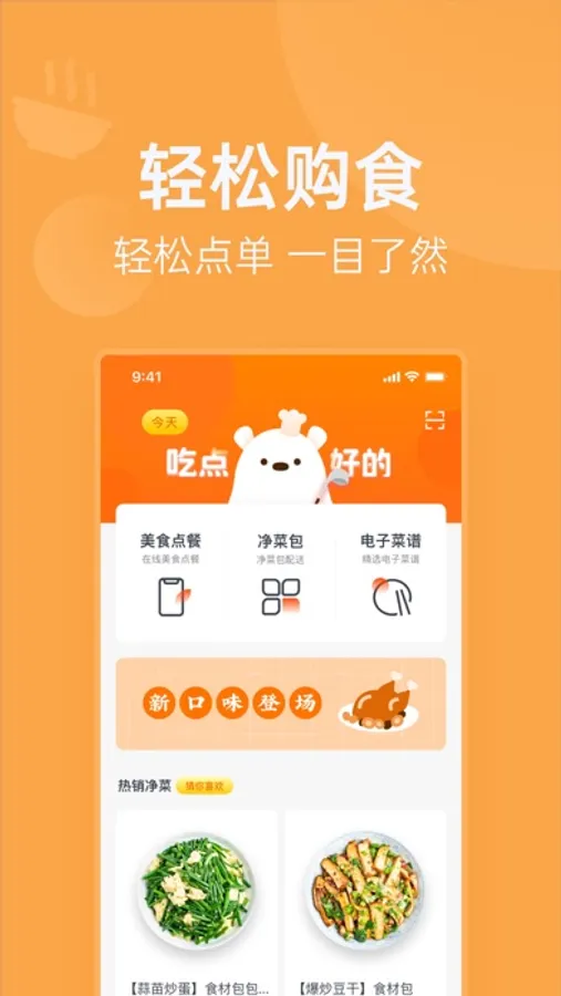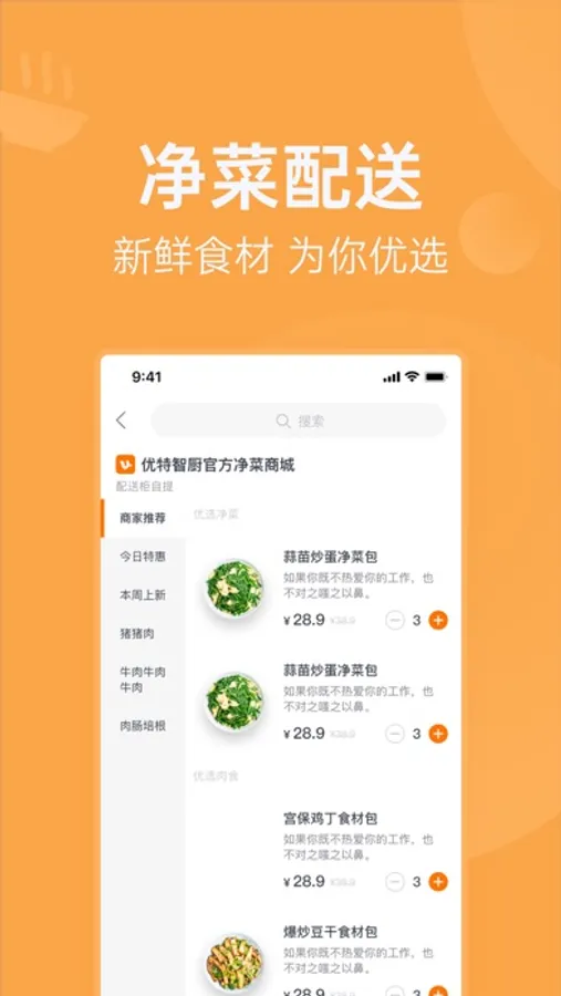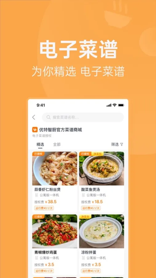 这是一款为家庭用户,打造全方位智能烹饪服务的APP,包含智能烹饪设备管理,电子菜谱授权管理和净菜配送服务的功能。使用明天吃U鲜APP,可以快速登录智能烹饪设备,将电子菜谱与设备中控同步。选择自己喜欢的菜谱,购买电子菜谱授权后,设备端即可运行该电子菜谱。同时也可以购买对应的净菜包,按照电子菜谱的指引,轻松烹饪出星级大厨水准的美味佳肴。