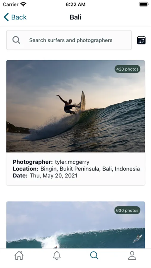 A surf photography marketplace. Photographers upload photos of surf sessions, surfers can discover photos of themselves surfing and purchase them.