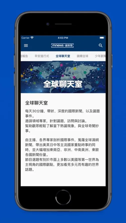 鏡新聞以多元、專業、深度、國際、藝文、弱勢為特色,期待提供給大家耳目一新的優質新聞內容,也歡迎閱聽人隨時給我們建議。
