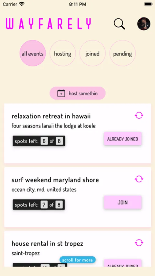 maybe you want to join something that's already in the works? browse (and join) events by category, vibe, location, or whatever is important to you! if you come across private events, you'll have to get the green light from the host to join.