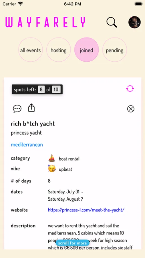 that's why we are launching wayfarely. we value in-person connection, and we believe that we can no longer take it for granted. meet new people. reconnect with old friends. build your relationships. across the world on a boat, or down the street for happy hour. wayfarers chase experience - corporeal, whimsical, and serendipitous.