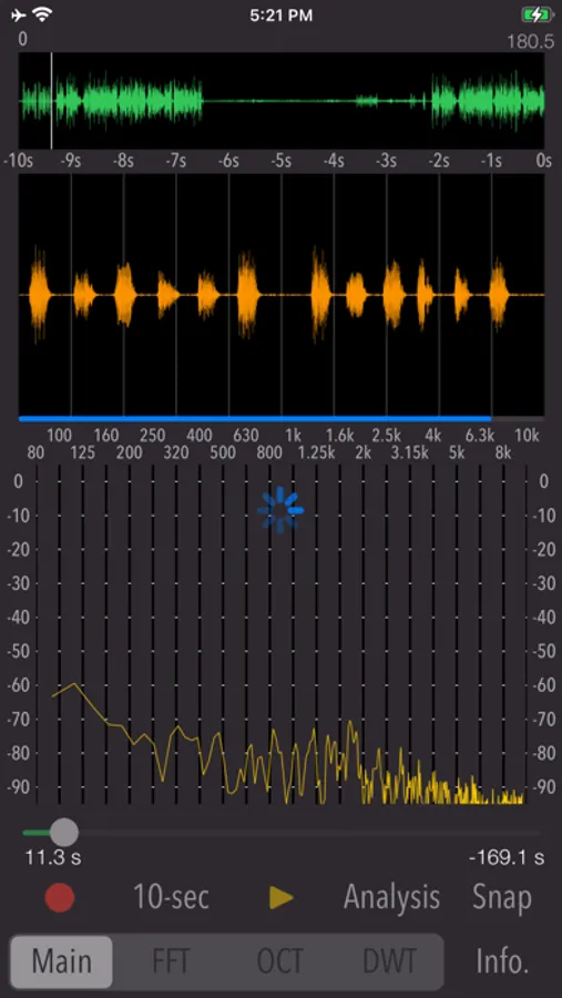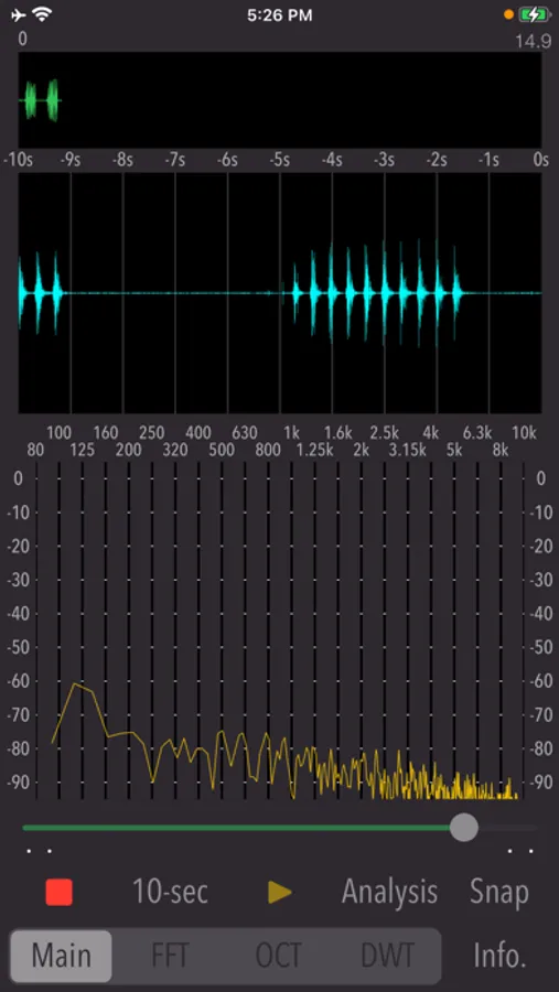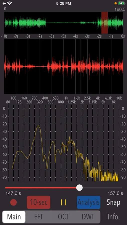It can record sounds from iPhone built-in microphone. While playing the sound, you can search for the desired sound and analyze it.