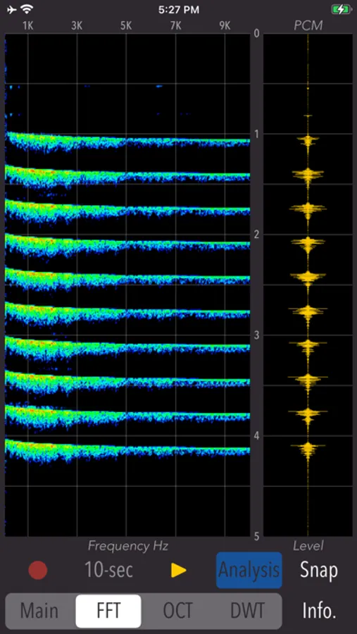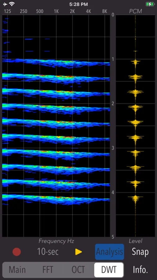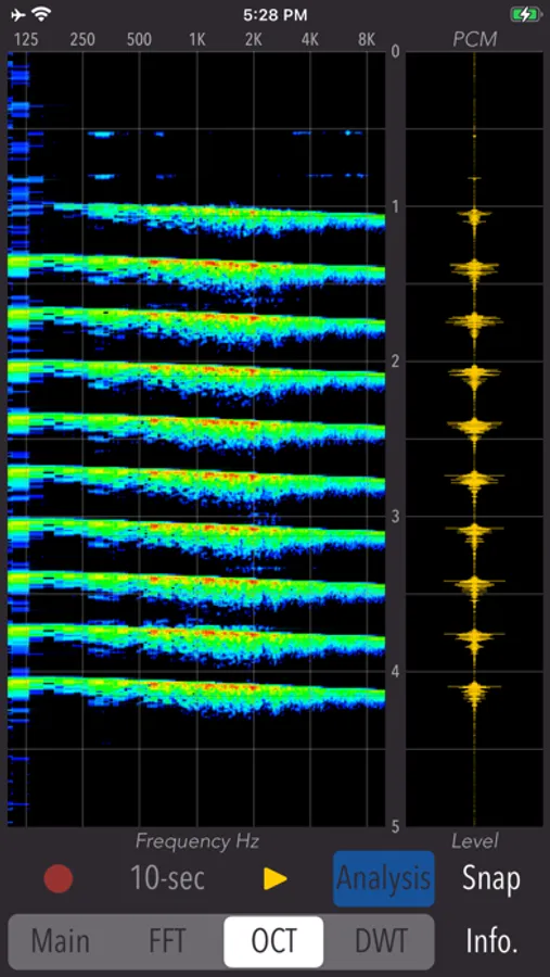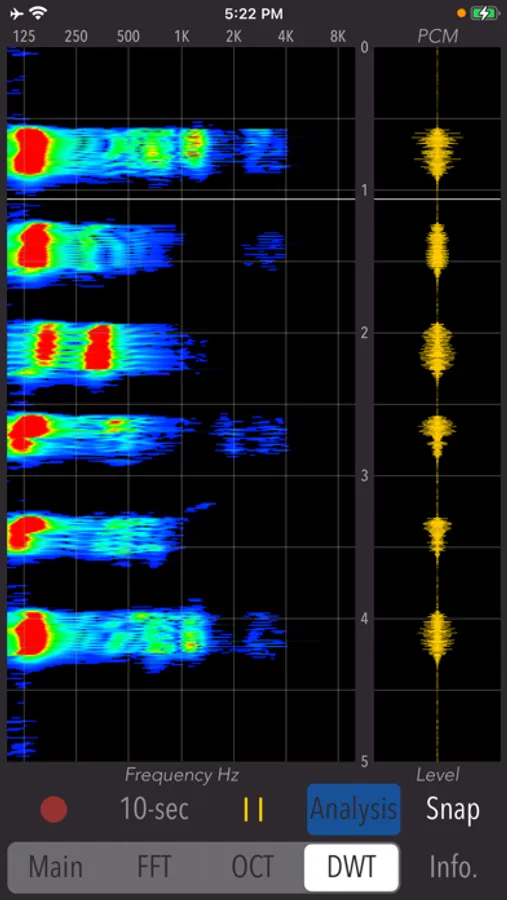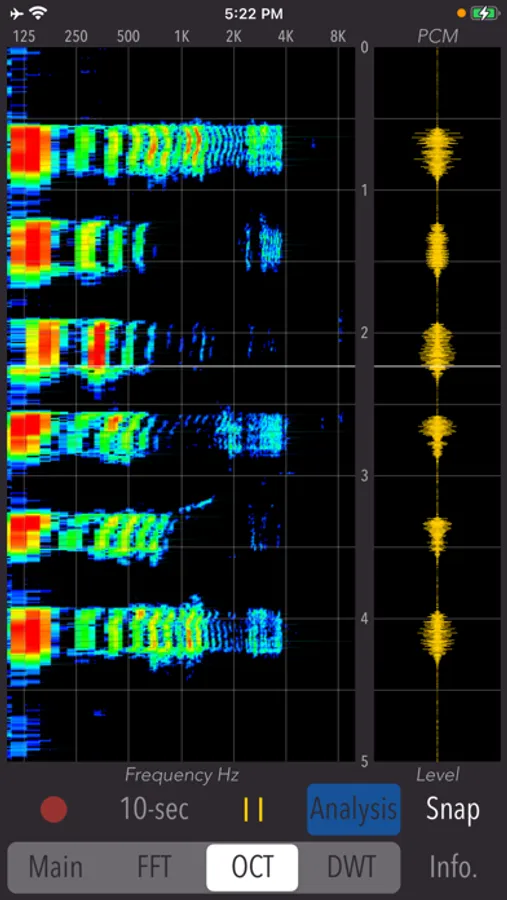 - Spectrogram display (FFT / OCT / DWT): 5 sec PCM graph and spectrogram analysis graph (vertical axis - time [0 - 5.0 sec], horizontal axis - frequency [100Hz - 8kHz])
