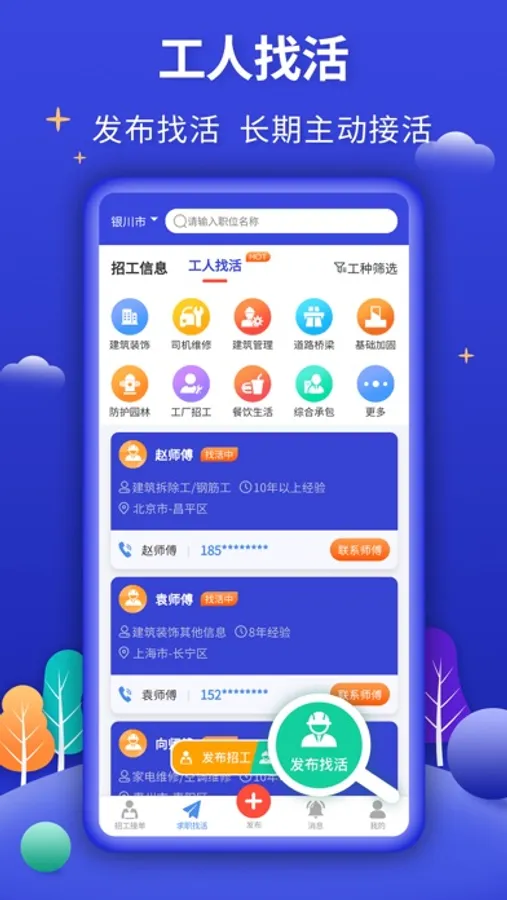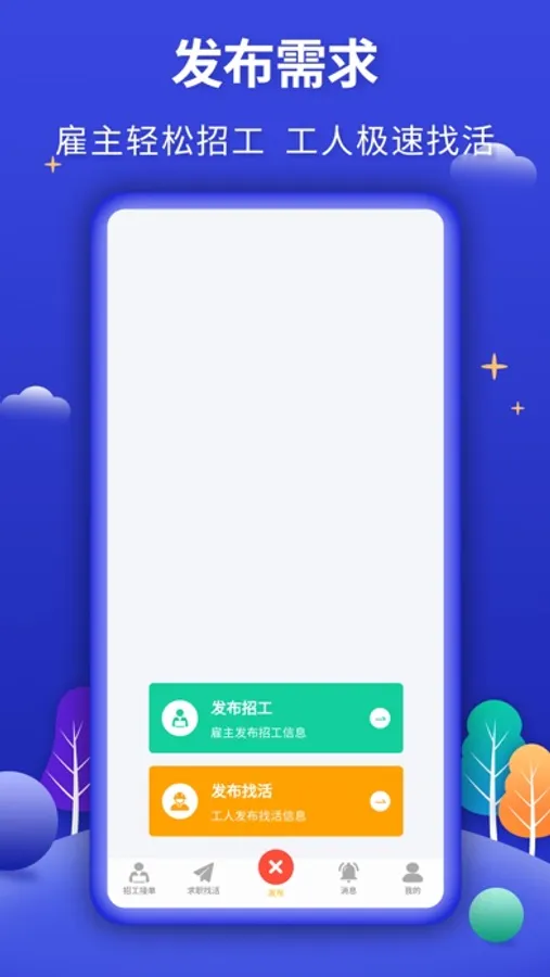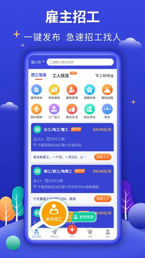 2.一键发布招工、找活,方便快捷,招聘者的贴身之宝,让找工人从此就是这么方便,工人党的福利、招聘者的助手。