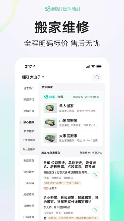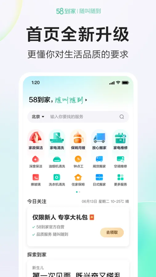 58到家,是国民生活服务平台。提供百余类高品质生活服务,包含保洁清洗、保姆月嫂、家电维修、搬家速运、洗衣洗鞋等家庭服务品类,为您提供专业、优质、有保障的一站式生活服务,随叫随到,为您解决生活中的小麻烦。
