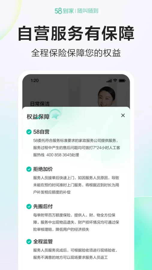 58到家已入驻全国128个城市,包含近300类服务,提供优质生活解决方案。平台服务标准严格、价格透明,只需轻松预约,服务随叫随到。平台为每位用户提供人身和财产保险,免除您的后顾之忧。线上和电话客服帮您解决问题。58到家,让服务更放心,让生活简单美好。