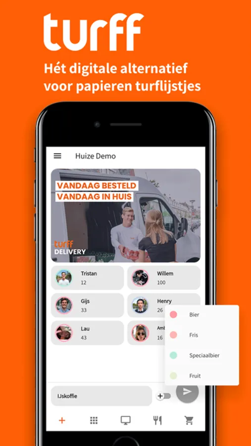 Voeg zelf items toe en zet op de Turff wat je maar wil! Stel prijzen in per item en deel gemakkelijk de kosten van bier, koffie, fris, frituur en andere snacks!