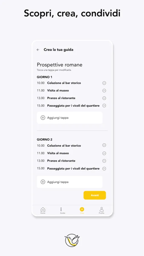 Unisciti alla community e divertiti a creare i tuoi itinerari aggiungendo foto, localizzazione, descrizioni, consigli e tempi di percorrenza. Segna monumenti, piazze, negozi, parchi, ristoranti, punti panoramici, bar, passeggiate…Non ci sono vincoli. Puoi creare ad esempio una guida allo shopping, un itinerario in bici, un intero tour di luoghi segreti o un weekend romantico. Inventa nuovi tipi di itinerari e fai scoprire gli angoli più preziosi della tua città. Sperimenta nuovi modi per far conoscere il territorio.