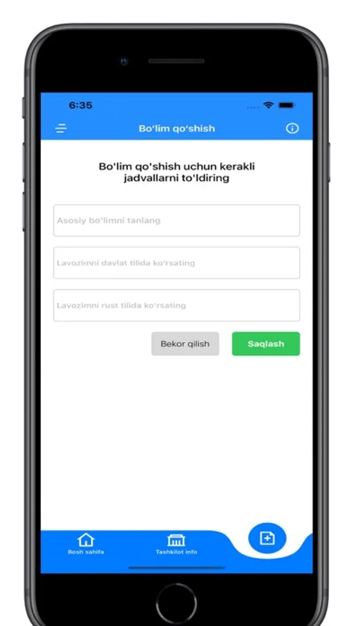-Tashkilotdagi bo'limlarni ko'rish,tahrirlash va o'chirish imkoniyati