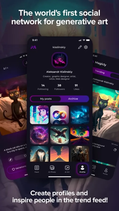 Introducing Magicly - the first social network for AI Generated Art. With our app, you can create profiles, be inspired by the artwork of other users, and share your own creations with the world. We have recently added a new feature - the Smart trend feed which will showcase the best work in AI Generated Art, giving every user the chance to get featured on the feed through voting and rating.